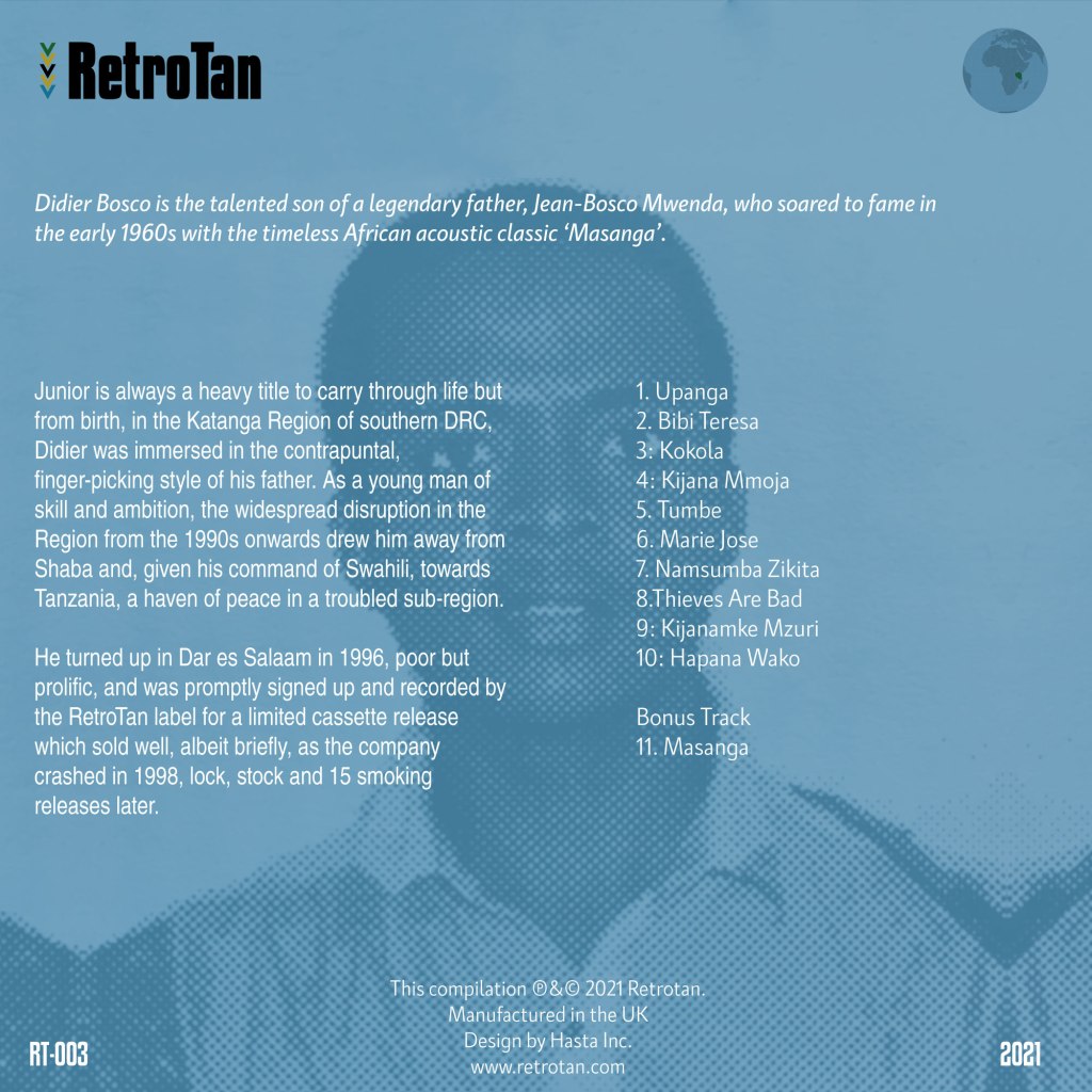 In 1996 Didier finally reached Tanzania and one day presented himself to RetroTan, a Tanzanian copyright protected cassette company, which was busy recording as wide a variety of music as possible, sell cassettes and pay advances and royalties in the face of the piracy pandemic. Following a brief business discussion Didier agreed to record and the very next day sat down with John Kitime, chairman of the Tanzanian Musicians Union, guitarist with Vijana Jazz and the recording engineer for RetroTan. Using a Sony Portable DAT recording machine Didier poured out a dozen or so songs of which ten found their way on to a cassette release entitled ‘Bumbulako’. Sales were initially impressive but the label was in trouble and within months had more or less collapsed as a going concern having released fifteen cassettes by the cream of Tanzanian bands over the previous 3 years.