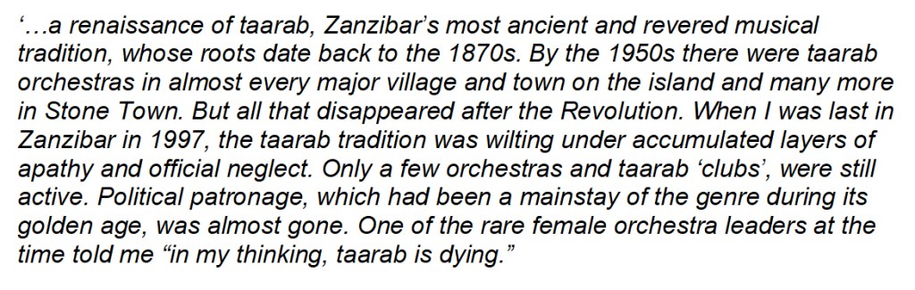 Janet Topp Fargion, The Role of Women in taarab in Zanzibar: An Historical Examination of a Process of “Africanisation” The World of Music, Volume 35 Issue 2, Pages 1993.