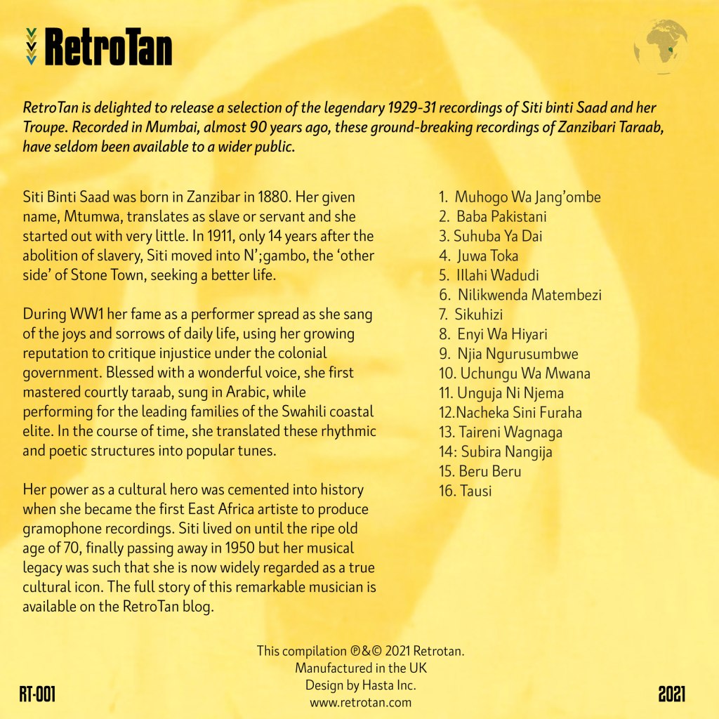 RetroTan is delighted to release a selection of the legendary 1929-31 recordings of Siti Binti Saad and her Troupe. Recorded by the Gramophone Company in Mumbai, almost 90 years ago, these ground-breaking recordings of Zanzibari Taraab, have not hitherto been available to a wider public, beyond the 4 tracks released by the National Sound Archive in the UK in 2007. Three of these are included here as bonus tracks, with the kind permission of the NSA.
